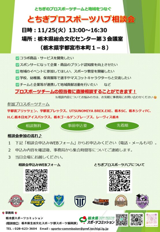 11/25(火)とちぎプロスポーツハブ相談会 ご案内 県央エリア更新日:2025.10.06 「とちぎプロスポーツハブ相談会」 日時:令和7(2025)年11月25日(火)13:00~16:30 場所:栃木県総合文化センター第3会議室(栃木県宇都宮市本町1−8) 参加チーム:宇都宮ブリッツェン、宇都宮ブレックス、USUNOMIYA BREX.EXE、栃木SC、栃木シティFC、H.C.日光アイスバックス、栃木ゴールデンブレーブス、レーヴィス栃木 チラシデータはこちらから 応募フォームはこちらから 前の記事 一覧に戻る ポスト LINEで送る シェア